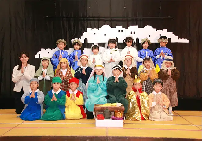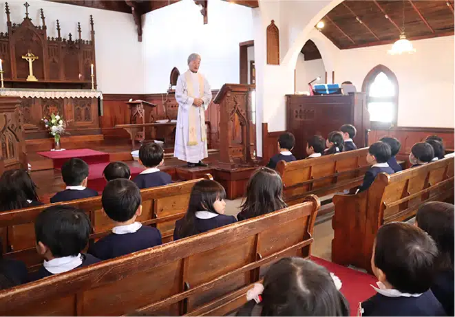全園児がお遊戯室に集まり、全員でお祈りをします。月に2回は司祭様より聖話を聞き、神様のお話しを通して”心の教育”を実践し、”感謝・思いやりの心”善悪の区別、を育みます。