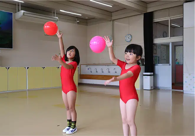 月に1度年長男の子が新体操、女の子がサッカーに取り組みます。男の子はダイナミックな身体の動かし方を知り、柔軟性や正しい姿勢を養います。女の子はボールを使った運動やサッカーのルールに親しみ、協調性を育みます。体づくりを通して丈夫な身体づくりに繋げています。