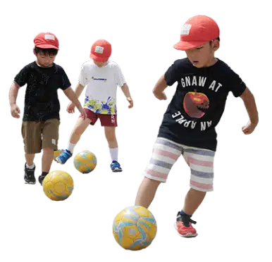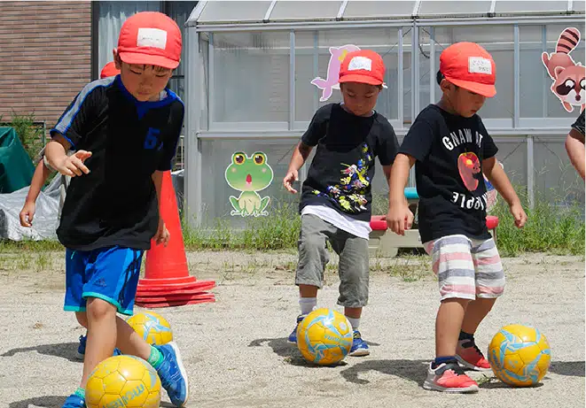 体力と運動機能の向上をめざします。ボールを追いかけ全身を使う練習が瞬発力と持久力を鍛え、楽しみながら健康的な身体を育てます。さらにチームワークを通し、仲間で心を一つに合わせる大切さを知り、パスや声かけを重ねる中で協調性とリーダーシップも伸び、挑戦する勇気が芽生えていきます。